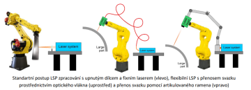 ramena, typicky cca 35 kg. Toto omezení výrazně zužuje aplikační potenciál technologie. Nabízí se otázka, proč proces neotočit a nepoužít laserovou hlavu na robotickém rameni a nehybný dílec. Důvodem jsou parametrylaserového svazku, konkrétně energie v pulsu (J) a jeho délka (ns), jež neumožňuje jednoduchý přenos optickým vláknem, což je standartní postup u jiných laserových průmyslových systémů. LSP proces, při němž používáme dynamický laserový a fixní dílec, souhrnně nazýváme „flexibilní LSP“ a jeho vývoj je jeden z hlavních cílů LSP skupiny v laserovém centru HiLASE. Obecně se uvažují 2 přístupy dynamického přenosu laserového svazku, a to pomocí speciálně vyvinutého laserového vlákna anebo pomocí speciálně navrženého artikulovaného ramena se spřaženými zrcadly.